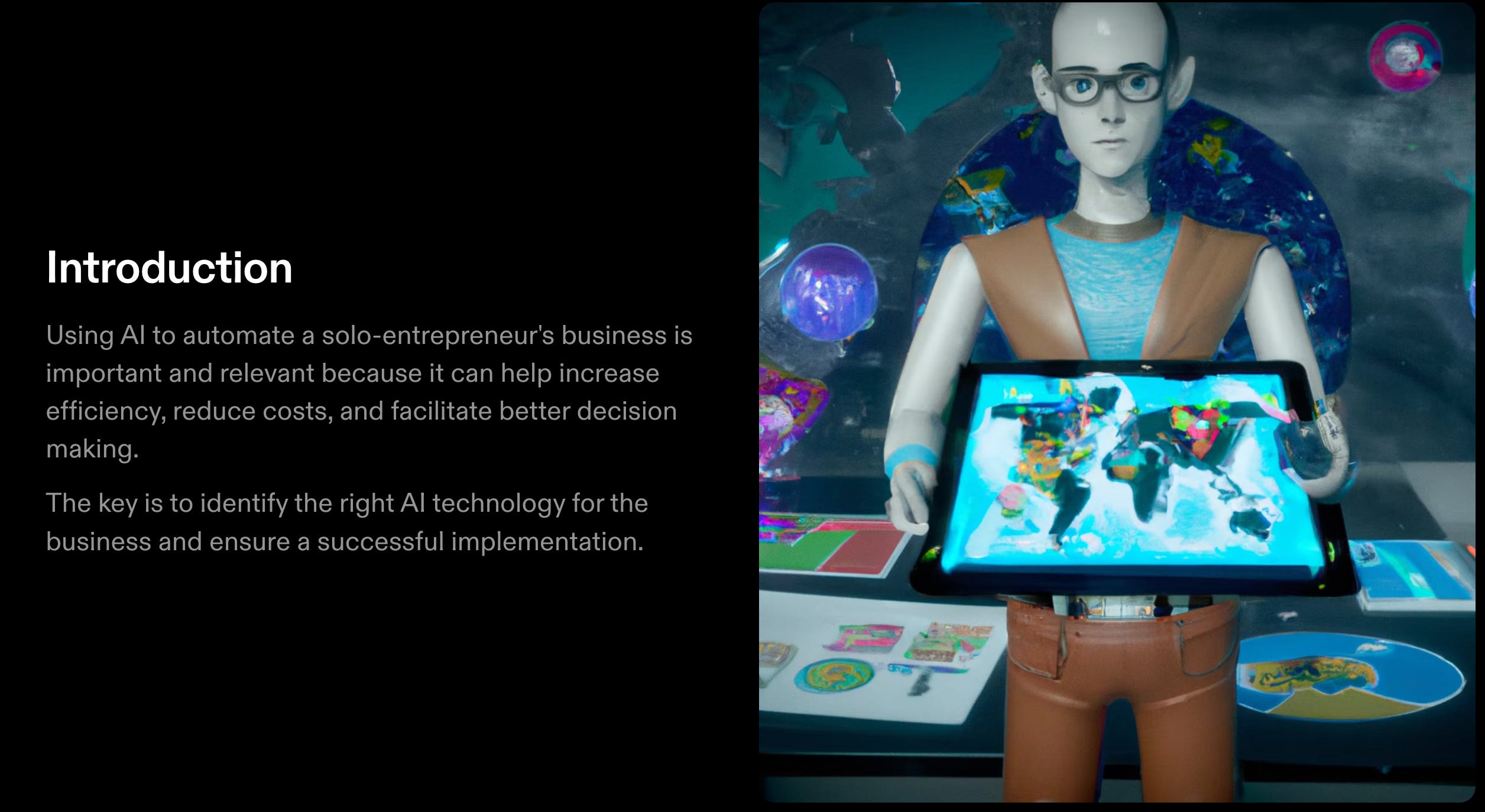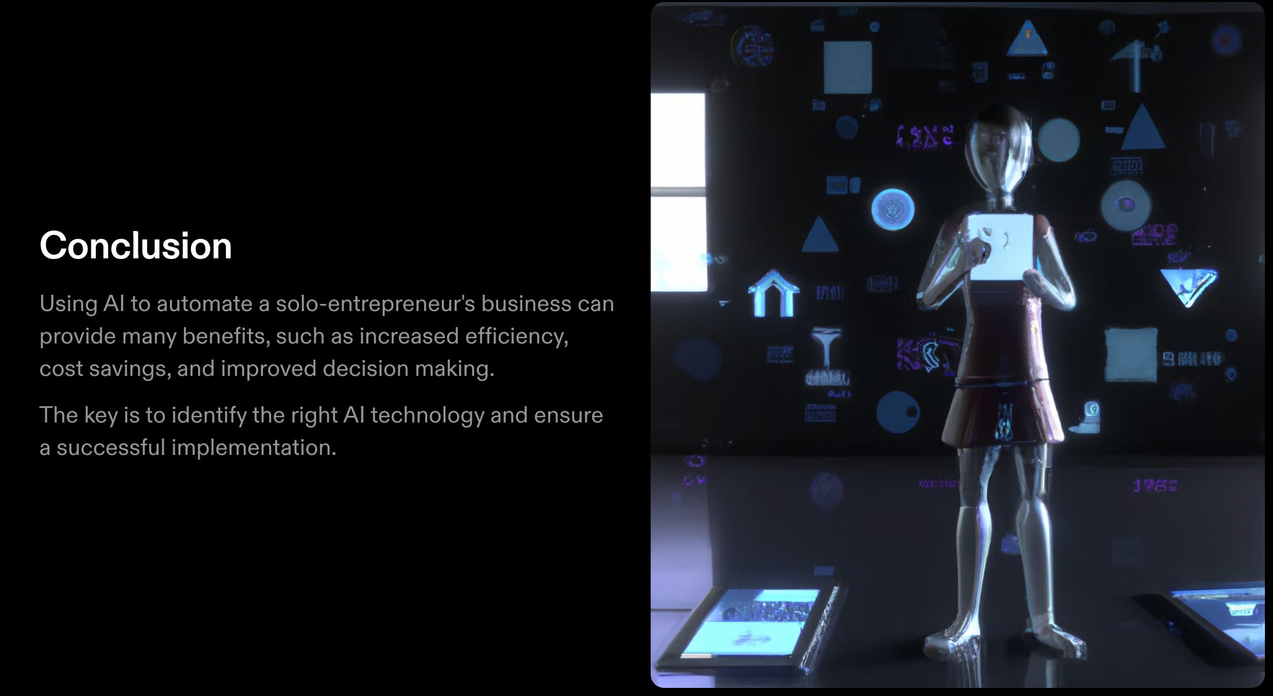 By implementing AI, a solo-entrepreneur can save time and money, and make better-informed decisions. In this presentation, we will explore the benefits of using AI, the different types of AI that can be used, and how to implement AI in a solo-entrepreneur's business.
