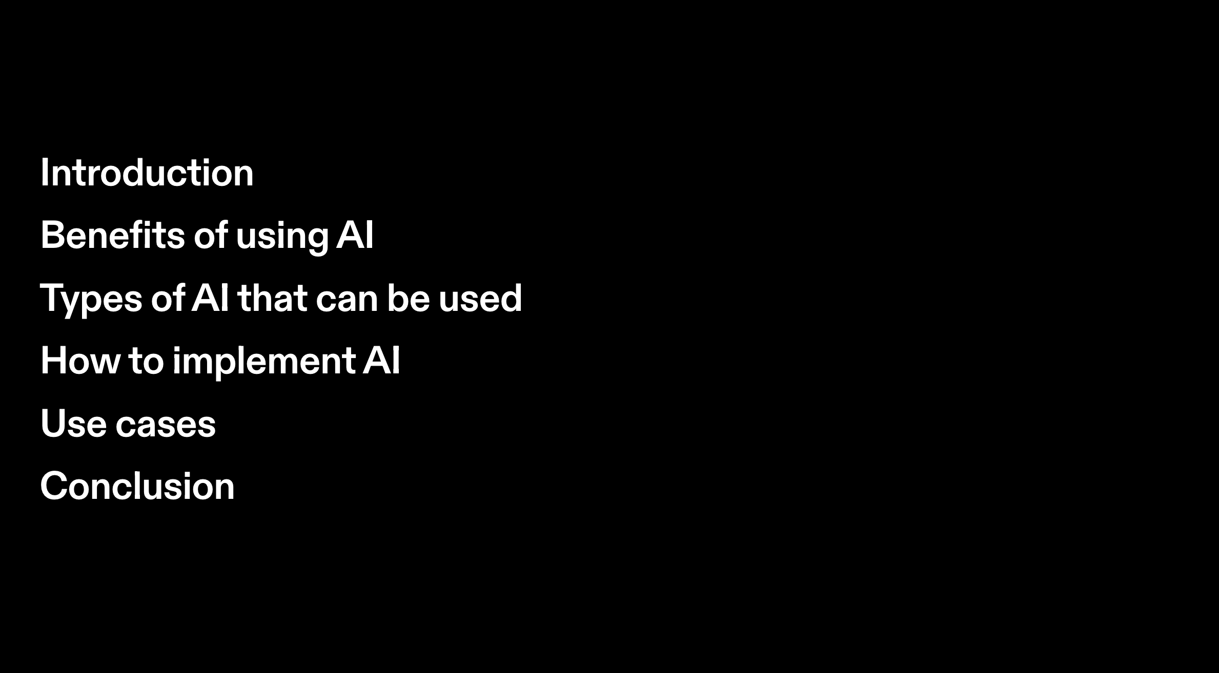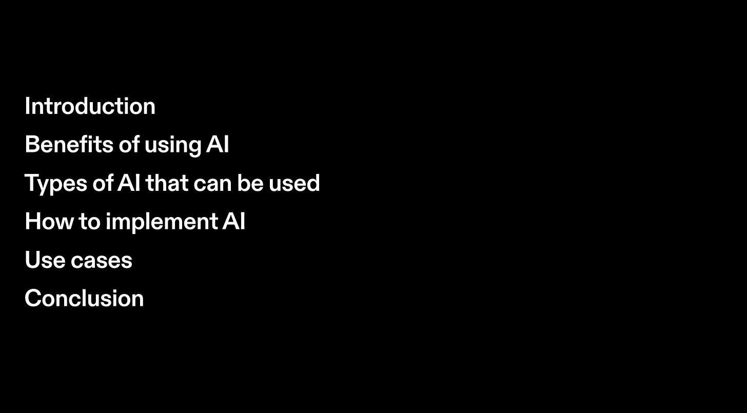 A lead-in to the next slides on the benefits, different types of AI and most important, HOW to implement. If you don’t tell the reader that they’re going to learn how to do it, there’s no reason to read past that point.